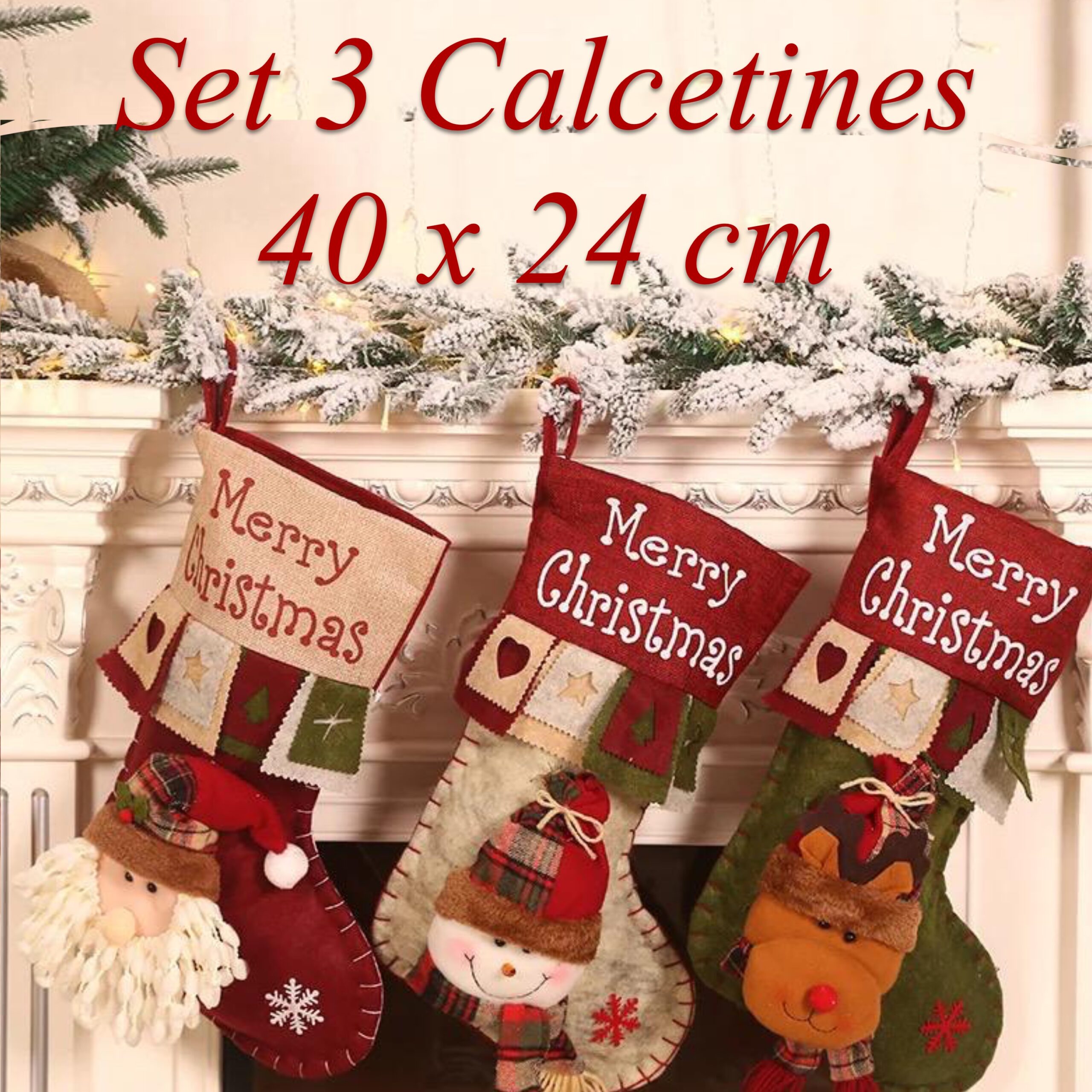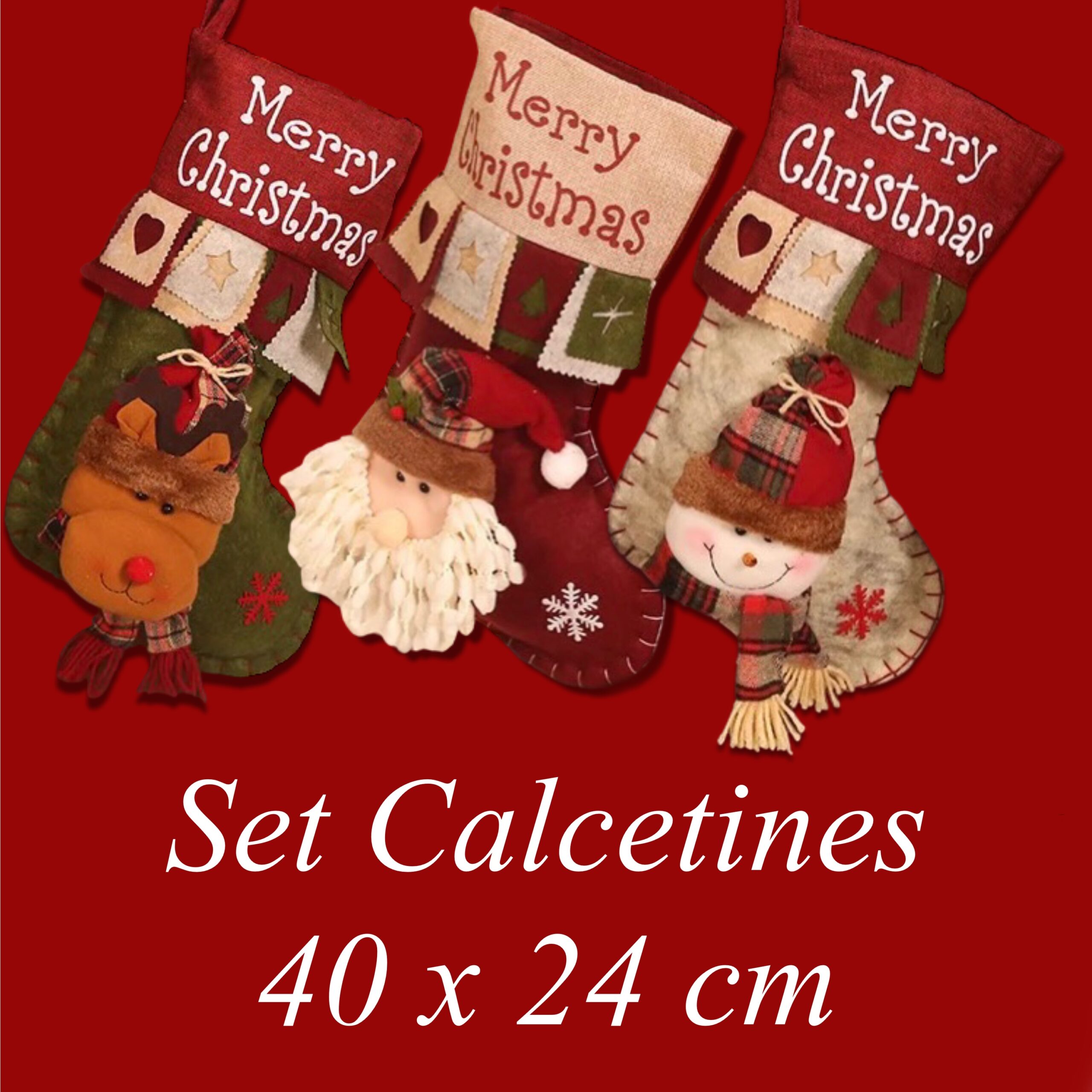 Set de 3 calcetines Navideños, de Reno, Santa y muñeco de nieve. tamaño 40×24 cm cada uno.