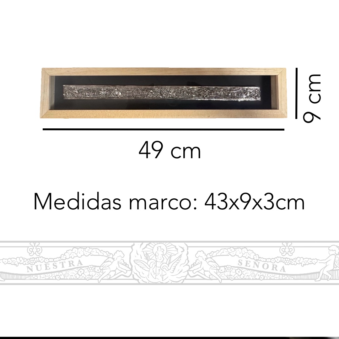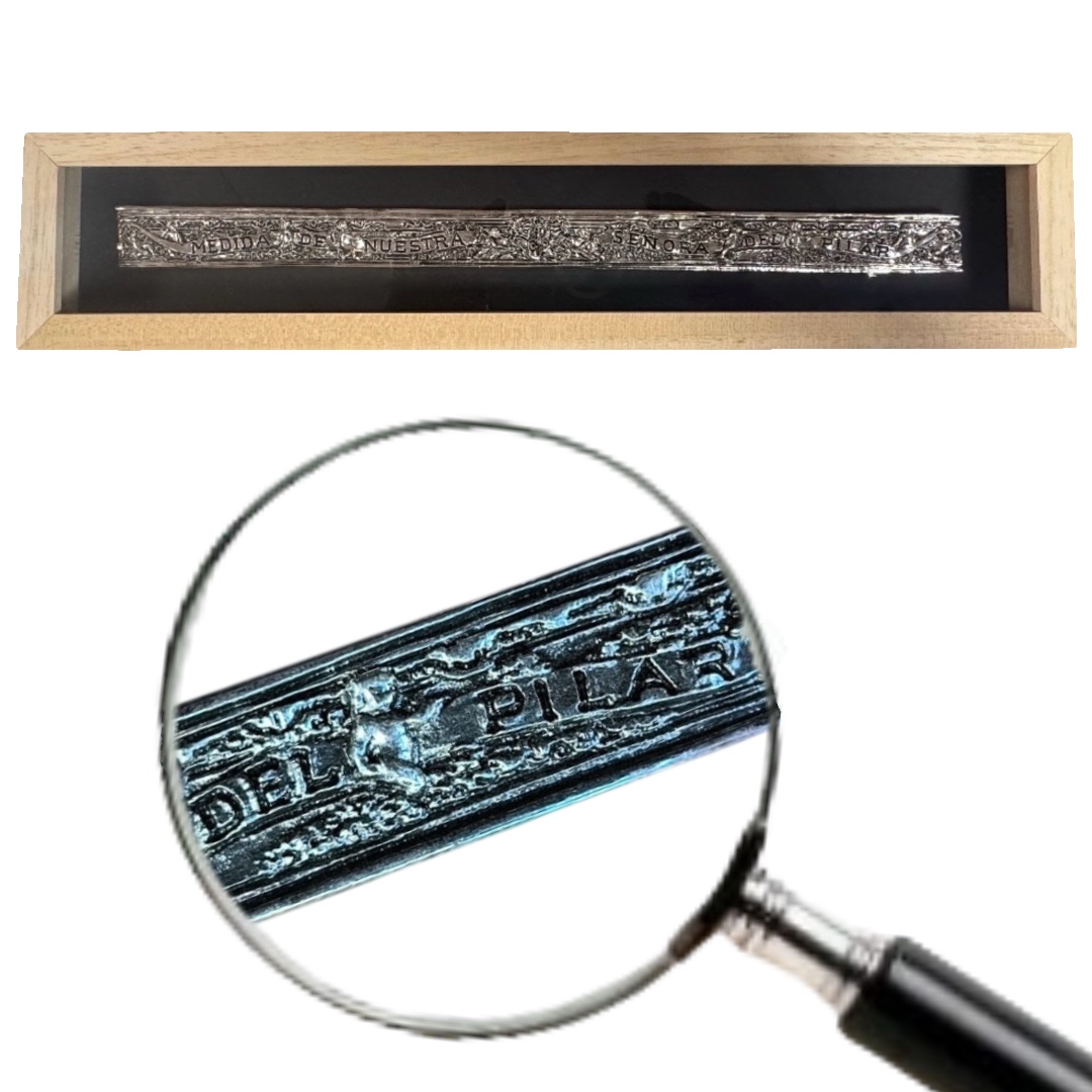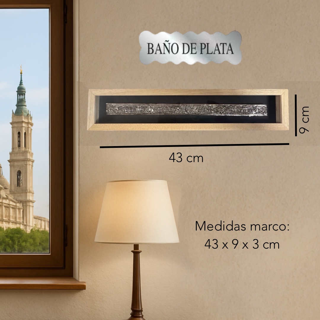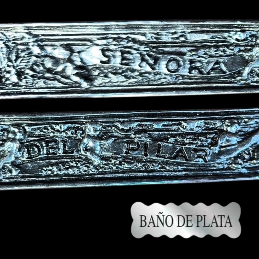 Pieza en relieve, con el diseño de la famosa medida de la Virgen del Pilar de Zaragoza, con sus 36,5 cm, bañada en plata fina, y enmarcada en cabina suspendida.
